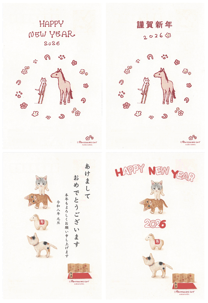 今年もあとわずかです。 来年は午年(うまどし)です。 ポタリングキャットオリジナル猫年賀ハガキ、発売中です。 馬と猫のやりとりがカワイイ年賀ハガキをご覧下さい。
